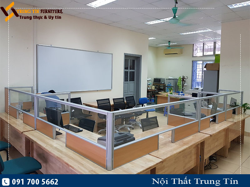 Vách ngăn khung nhôm định hình gỗ kính. Sử dụng ke K1/K2/K3 để bắt mặt bàn. Dưới chân vách có hộp kỹ thuật để chạy dây điện, dây cáp... tạo ra sự gọn gàng cho cho văn phòng. Vách có các hệ dày 32, 35, 39, 45, 54, 60 mm tùy theo nhu cầu của khách hàng. Chất liệu: