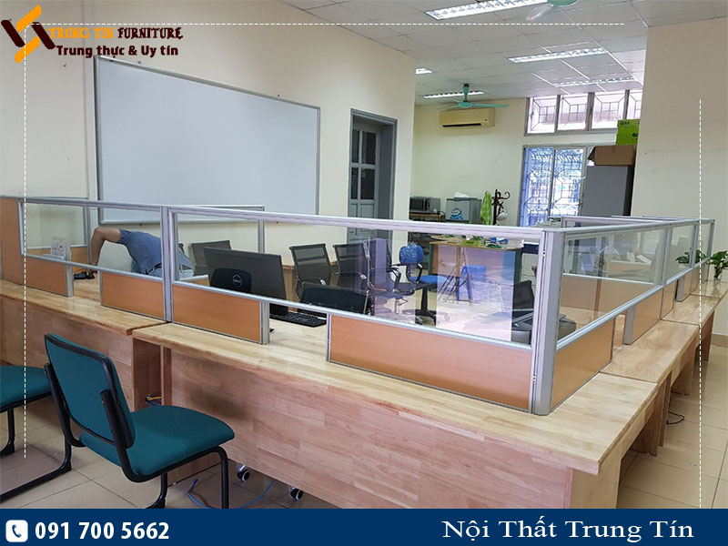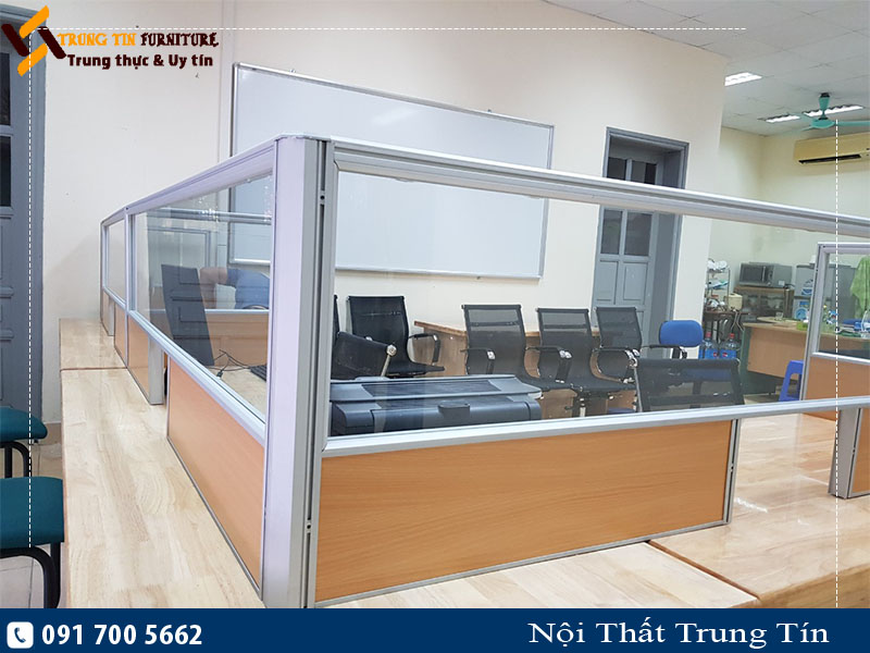 Vách ngăn văn phòng gỗ kính chia không gian làm việc thành nhiều phần khác nhau rất phù hợp với dân văn phòng là ưu điểm nổi bật của mẫu vách ngăn gỗ kính. Vách ngăn sử dụng khung nhôm sơn tĩnh điện ánh nhôm chắc chắn, bề mặt phía dưới bọc gỗ, phía trên kính trong. Sử dụng mẫu vách ngăn văn phòng này không những bền đẹp, giá hợp lý là còn rất hợp thời trang.