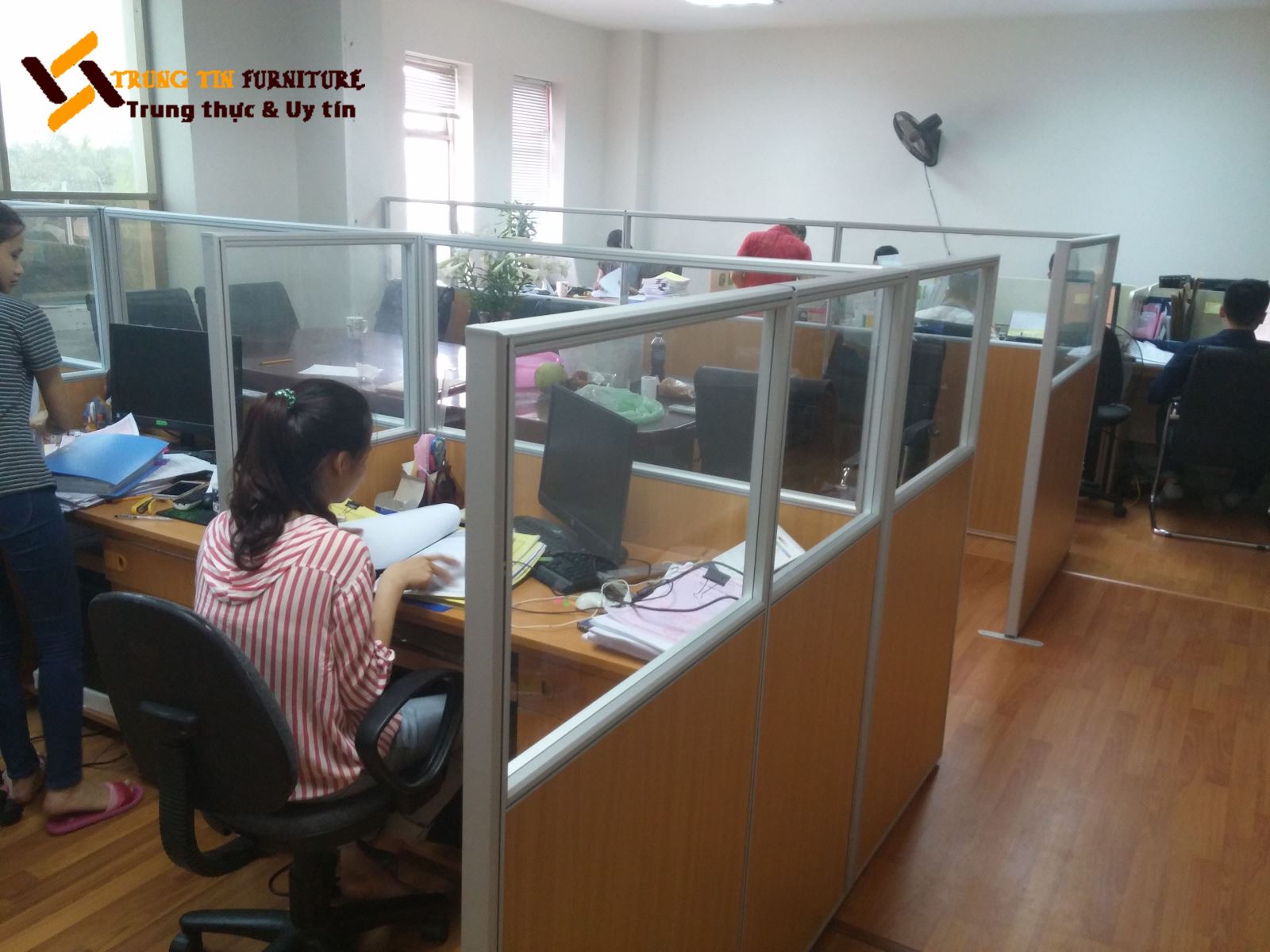 Vách ngăn văn phòng VNGK01 sử dụng khung nhôm phun cát, vách kính trên, vách gỗ dưới.
