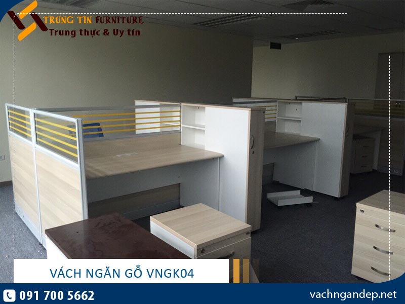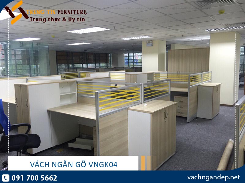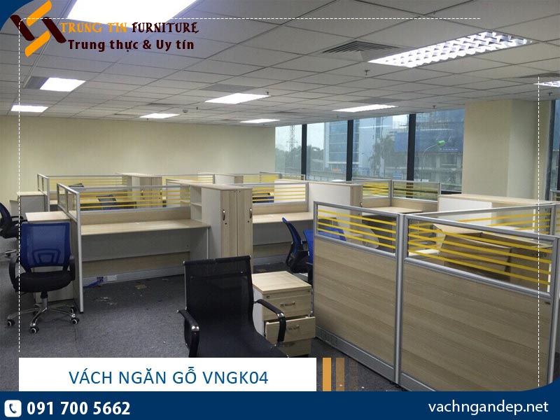 Vách ngăn văn phòng gỗ kính VNGK04 sử dụng khung nhôm phun cát, bao gồm 2 vách: vách trên kính được dán decal sọc ngang bắt mắt, vách dưới gỗ toàn bộ, phân tách bằng khung nhôm. Vách ngăn gỗ kính VNGK04 có kết cấu vững chắc, dễ dàng tháo lắp, tạo không gian làm việc theo module gọn gàng ngăn nắp với không gian làm việc riêng. Sản phẩm vách ngăn văn phòng gỗ kính có nhiều màu sắc vân gỗ dễ dàng phối màu với các đồ nội thất khác, thi công sản xuất nhanh, dễ dàng tháo lắp di chuyển, giá thành hợp lý nên được rất nhiều khách hàng ưa chuộng.