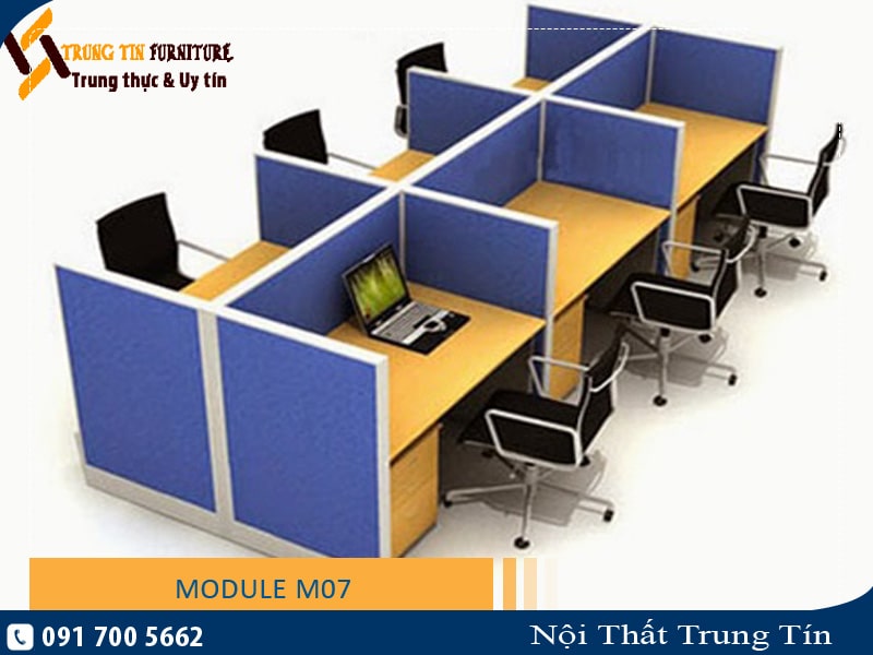 Vách ngăn khung nhôm bọc nỉ mầu xanh dương. 6 bàn làm việc đối diện nhau. Vách ngăn dầy 35mm, 56mm hoặc 60mm có kết hợp hộp kỹ thuật đi dây điện, dây mạng phía dưới. Vách ngăn cao 1m2. kích thước mặt bàn 600mmx1200mm dầy 25mm. chất liệu Melamin (MFC) an Cường. Cụm bàn 6 người có thể nối thêm hoặc giảm vị trí ngồi nếu chủ đầu tư yêu cầu mà không ảnh hưởng đến các vị trí khác.