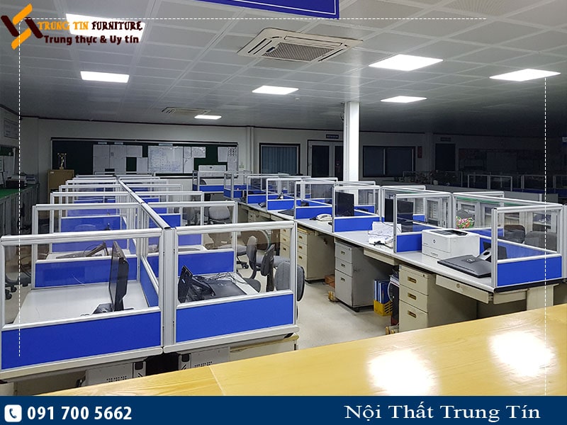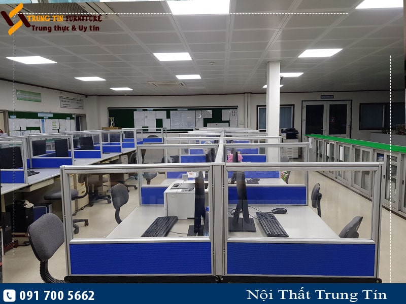 Vách ngăn khung nhôm định hình nỉ kính. Sử dụng ke K1/K2/K3 để bắt mặt bàn. Dưới chân vách có hộp kỹ thuật để chạy dây điện, dây cáp... tạo ra sự gọn gàng cho cho văn phòng. Vách có các hệ dày 32, 35, 39, 45, 54, 60 mm tùy theo nhu cầu của khách hàng. Chất liệu: