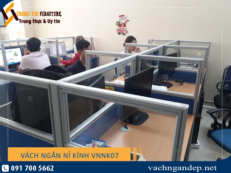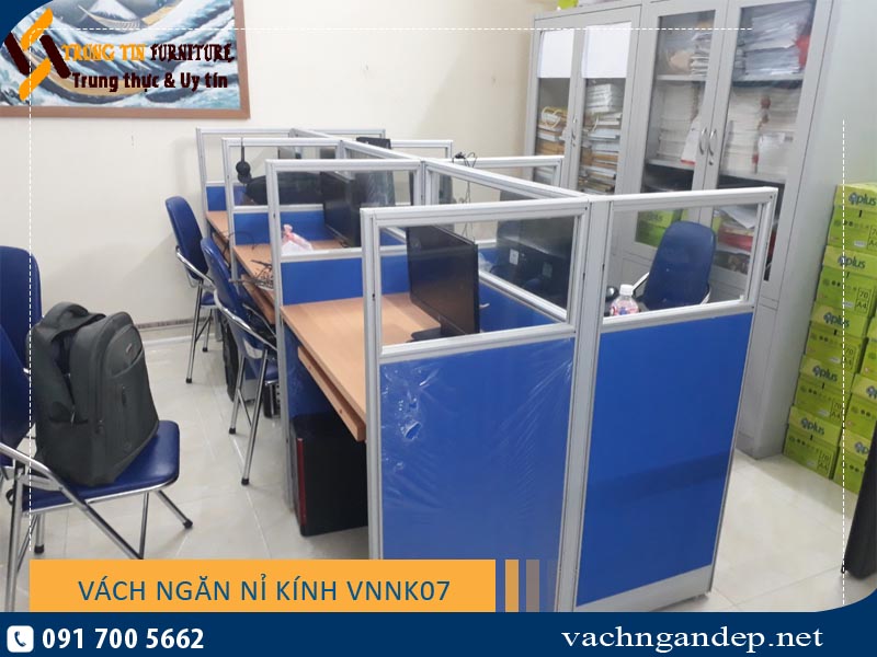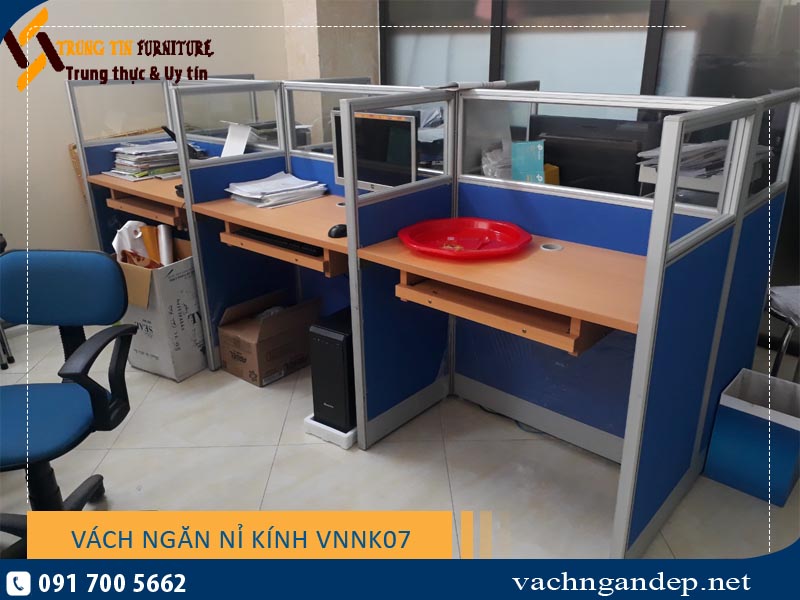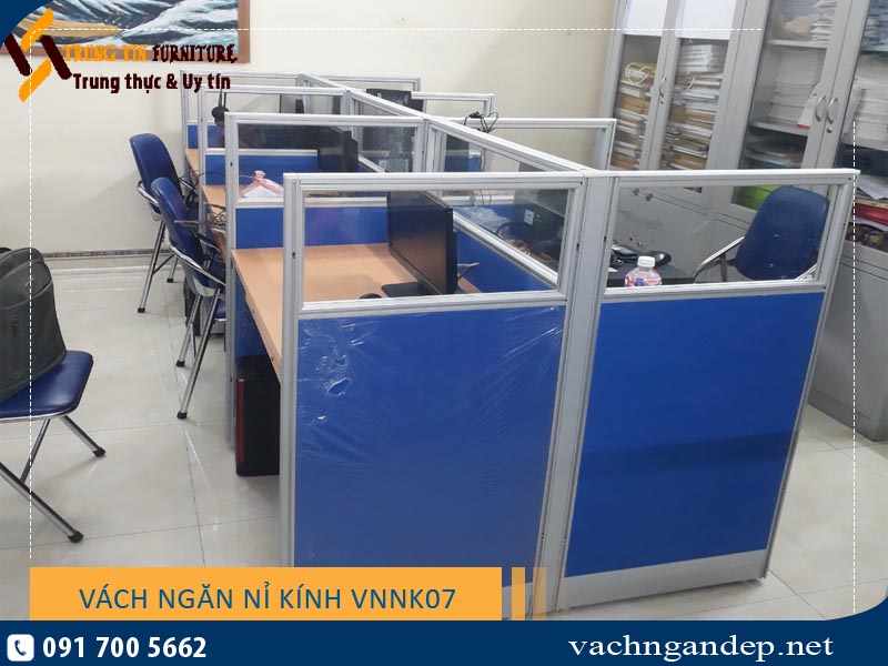 Vách ngăn văn phòng nỉ kính VNNK07 sử dụng khung nhôm phun cát, bao gồm 2 vách: vách trên kính, vách dưới Nỉ, phân tách bằng khung nhôm. Vách ngăn nỉ kính VNNK07 có kết cấu vững chắc, dễ dàng tháo lắp, tạo không gian làm việc theo module gọn gàng ngăn nắp với không gian làm việc riêng. Sản phẩm vách ngăn văn phòng có tông sáng dễ dàng phối màu với các đồ nội thất khác, thi công sản xuất nhanh, giá thành hợp lý nên được rất nhiều khách hàng ưa chuộng.